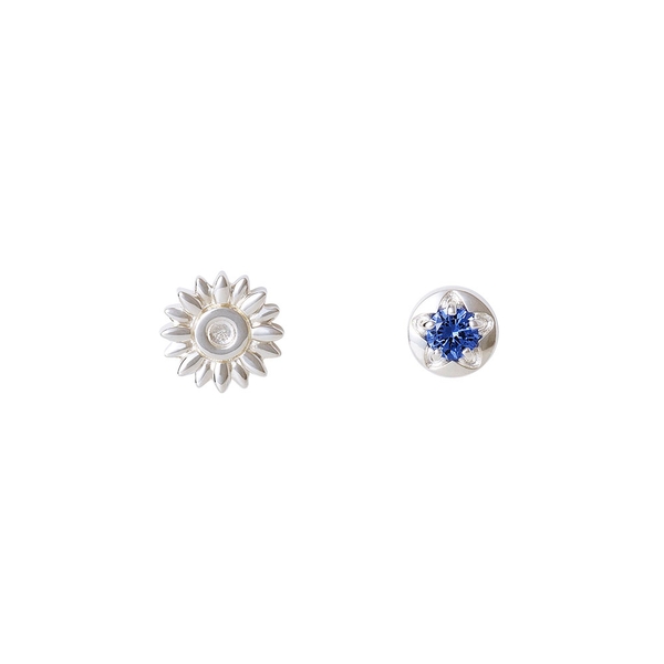 片方はデイジーの花のモチーフ、もう一方はイメージカラーストーンをセットした一粒タイプのアシンメトリーなデザイン。