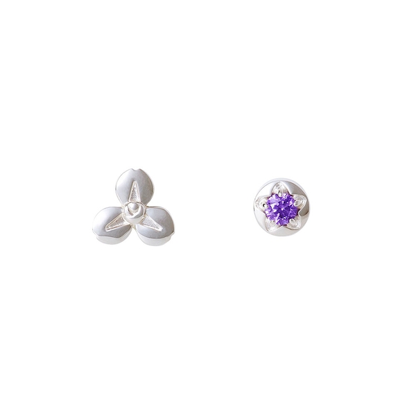片方はアイリスの花のモチーフ、もう一方はイメージカラーストーンをセットした一粒タイプのアシンメトリーなデザイン。