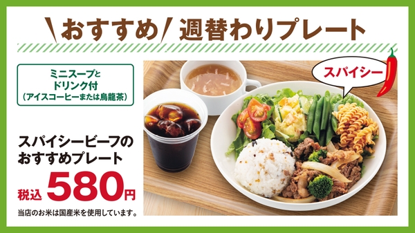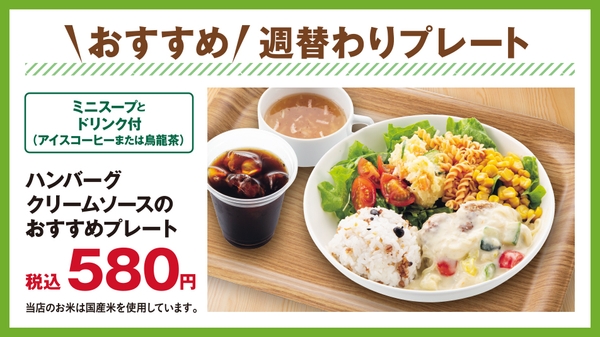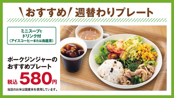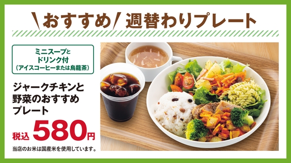また当店では、週替わりでお得な「おすすめ 週替わりプレート」を提供しています。ワンプレートにメインディッシュと雑穀ごはん、サラダを盛り合わせました。4つのメニューを毎週木曜日に更新していきます。