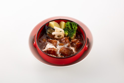 じっくり煮込んだ柔らかポーク肉と根野菜が入ったシチュー。隠し味に黄桃を使った”コク深い”味わいが特徴です。