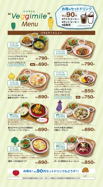 2019年3月にイオン豊橋南店のフードコートに出店した「Veggimile」では、ファミリーでお越しになるお客さまにむけ、小さなお子さまから大人までお手頃な価格で楽しんでいただけるよう、オムライスやパスタなどの洋食を中心としたお食事をワンプレート・ワンボウルにて提供しています。