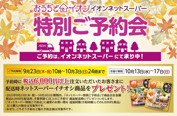 イオンリテール㈱東海カンパニーは、9月23日(木・祝)~10月3日(日)の期間、愛知・岐阜・三重・静岡県内の「おうちでイオン イオンネットスーパー」対象店舗にて、【秋の味覚 旬のごちそう予約会】を実施します。
