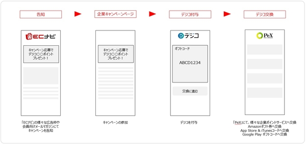 ユーザーが貯めたECナビポイントは、ポイント交換サイト「PeX」(https://pex.jp/)を通じて、現金や他企業の様々なポイントサービスに交換されます。「PeX」はデジコの交換先でもあり、ECナビユーザーと「デジコ」の親和性は高いと考えられ、デジコを活用したキャンペーンへの参加が期待されます。これまでも、企業のデジコを活用したキャンペーンを実施時に、「ECナビ」広告でのキャンペーン認知度向上や応募者の増加施策を個別で実施してまいりましたが、いずれも高い効果を得ることができたため、この度パッケージサービスとして提供することとなりました。