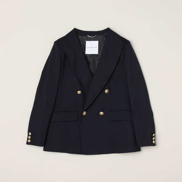 ブランドを象徴するキーアイテムの一つであるブレザー。ピークドラペルを採用した正統派のブレザーでありながら、大きめの衿のバランスや絶妙なカーブは男性的なアイテムの中にも、女性らしさを表現しました。見頃は三面体構造で直線的なシルエットに仕上げ、肩先から袖にかけて直線的に落ちるように裄綿や肩パットを選定し、都会的な印象に仕上げました。女性らしい美しいシルエットにこだわりました。