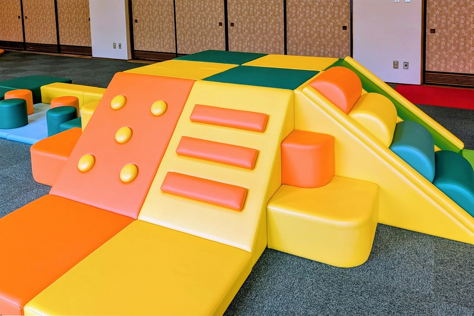 すべり台や平均台、飛び石など、山型のウレタン製遊具を設置したエリア。ウレタン製の遊具は、クッション性が高く、素材が柔らかいため、小さなのお子様も安心して遊べます。