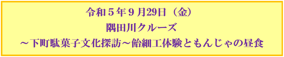 両国リバーセンター受付集合(8時50分)⇒水上バス乗船・両国リバーセンター発着場発(9時)~隅田川上る~千住大橋付近Uターン~浅草二天門着・水上バス下船(10時)⇒徒歩約5分・飴細工「アメシン」へ⇒飴細工体験(10時30分~12時30分)⇒徒歩約15分・「海鮮もんじゃ えもん」へ⇒もんじゃの昼食(13時~)=食後自由解散(15時までに)