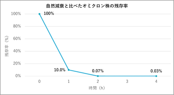 ストリーマ照射を2時間行ったオミクロン株は自然減衰と比べて99.93%不活化され、4時間のストリーマ照射では99.97%不活化されたことが確認できた。