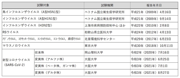 当社はこれまでにも、鳥インフルエンザウイルス(A型H5N1)やインフルエンザウイルス(A型H1N1)、マウスノロウイルス、新型コロナウイルスの従来株や変異株、食中毒の原因となる毒素や細菌といった有害物質に対して、大学及び公的研究機関と共同で効果を実証してきました。