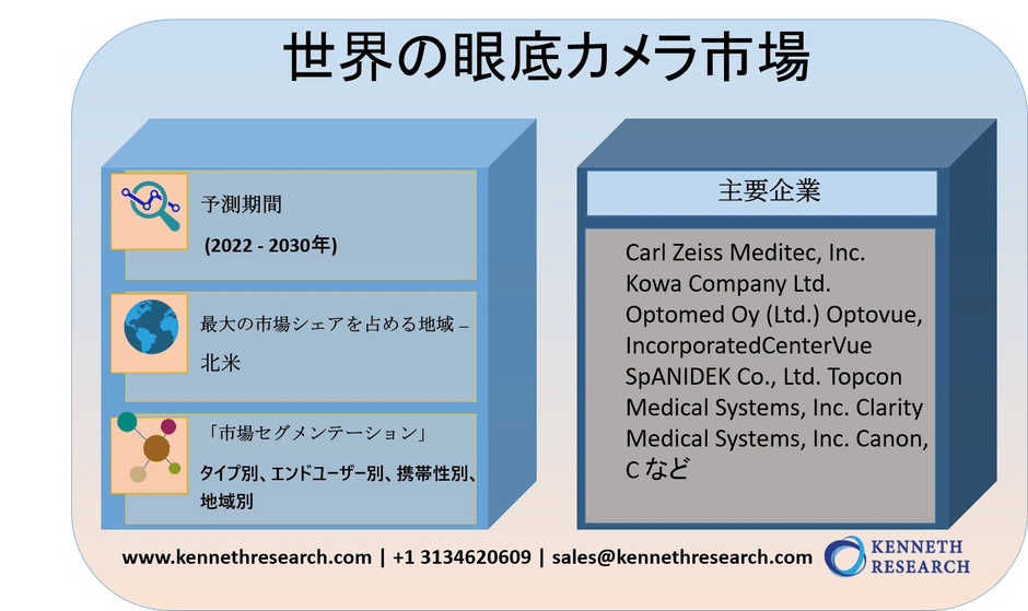 リサーチ・ネスターの一部門であるケネス・リサーチは、2022年1月12日に「世界の眼底カメラ市場:世界需要分析と機会見通し2030」と題する調査レポートを発表しました。詳細な市場業界の需要分析と、市場の成長に影響を与えるさまざまな要因を提供します。このレポートは、予測期間、市場価値、市場規模、成長率、セグメント、市場プレーヤー、成長ドライバーなど、市場の成長を提供します。調査方法には、市場評価と予測データ計算に基づいて過去および現在のデータを収集することが含まれます。このレポートのデータ収集には、一次調査と二次調査の両方が含まれます。