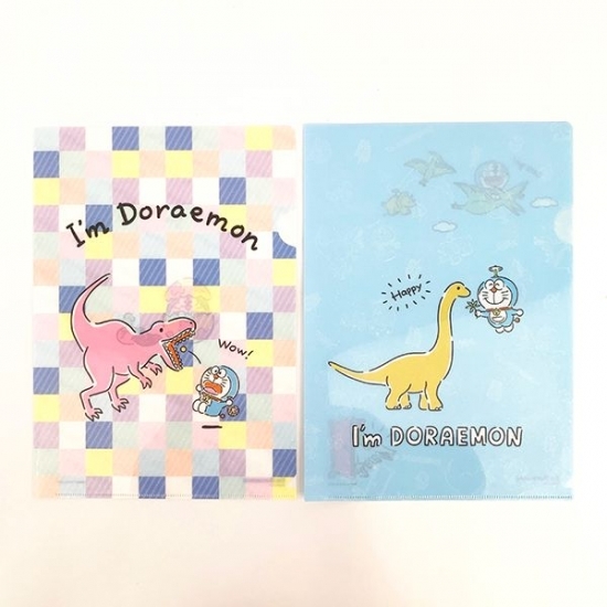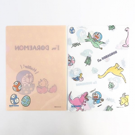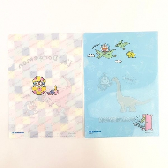 最後はA4のクリアフォルダーです。デザイン違いの2種類セットで、どちらもニューデザイン♪恐竜と仲良しなドラえもんがデザインされています。