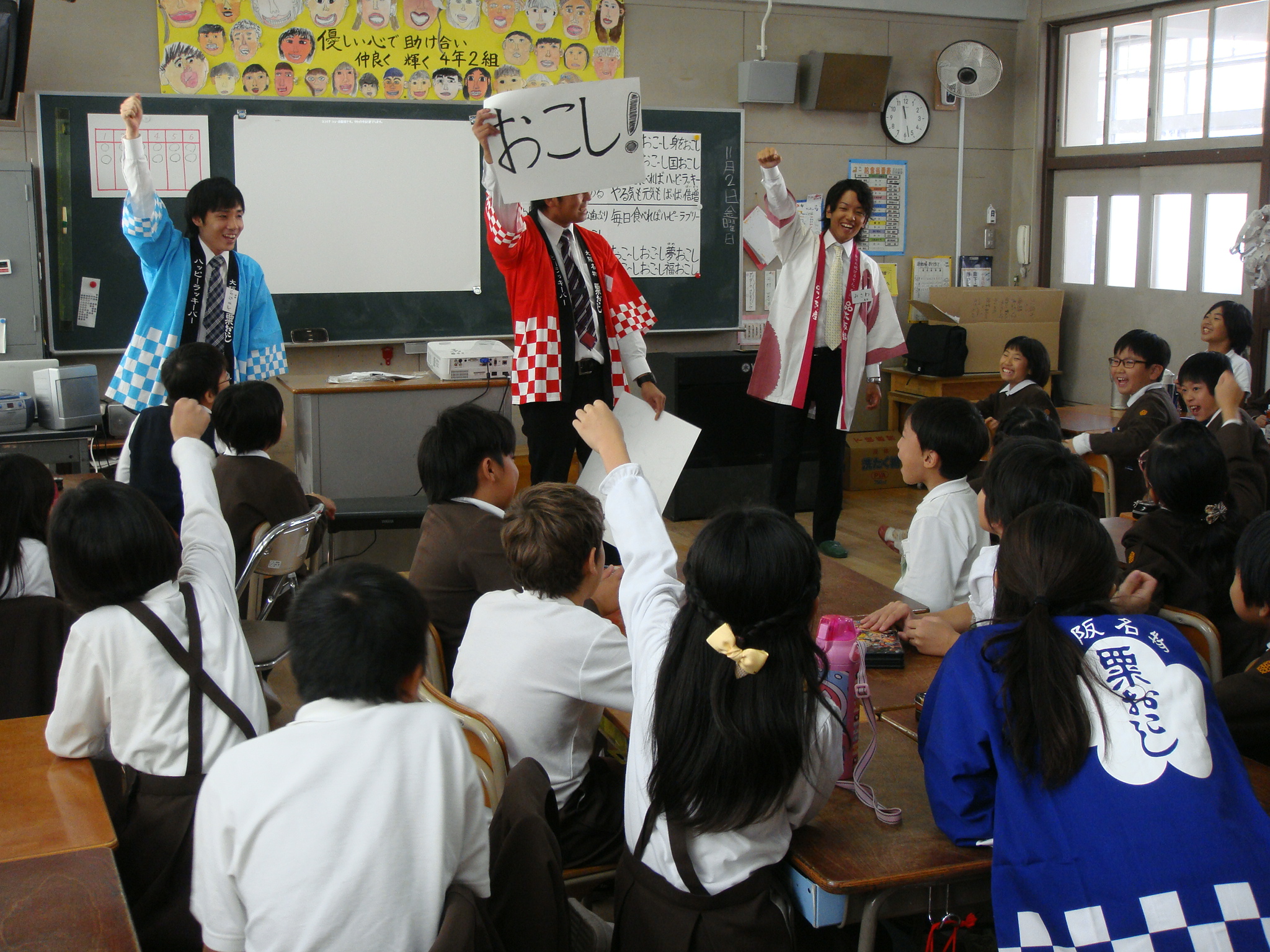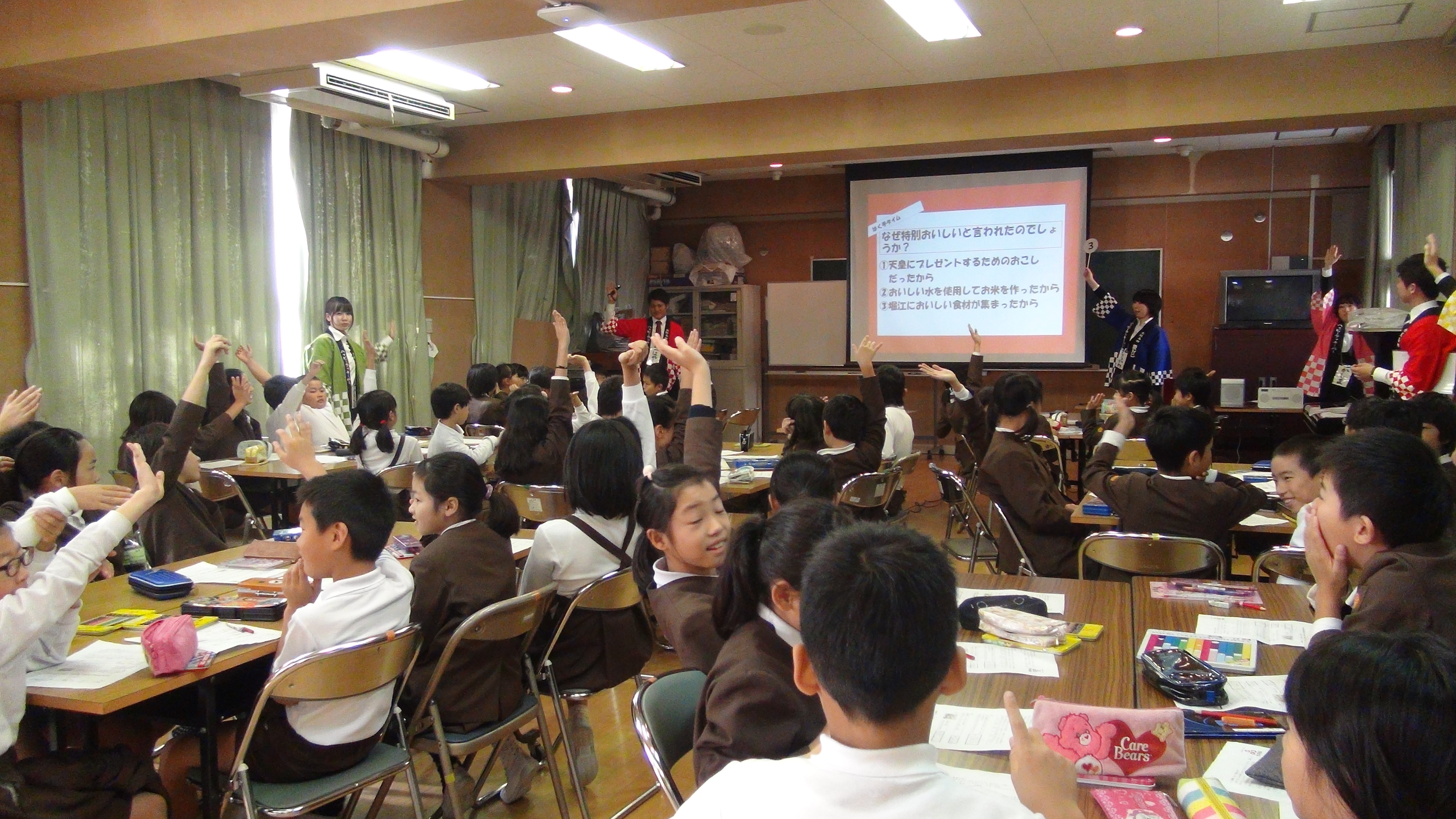 あみだ池大黒本店では3年前より年1回、本店近隣の大阪市立堀江小学校で「食育授業」を行っています。大阪府環境農林水産部流通対策室の協力で、対象となる4年生(約120名)に「大阪産(もん)」及び「大阪産(もん)名品」についてクイズ等を交えながら楽しく学んでもらっています。生徒は「自分が生まれ育った大阪に、こんなにたくさんの誇れるものがあるんだ!」と、毎回顔を輝かせてくれています。「おこし」は若い世代間での認知度が低くなってきているのが現状ですが、授業の中で大阪の歴史と関連づけて江戸時代から長く愛され続けてきた大阪銘菓「おこし」の魅力を次世代に伝えることは大変重要だと「食育授業」に臨んでいます。昨年度は食育授業の後、”おこし”への興味関心をもった生徒さんや保護者の方があみだ池大黒本店にも52名来店。今後も次世代の方々が大阪への郷土愛を育み、大阪産(もん)名品に愛着を持ち、周りの方々へどんどん発信していただける様に努力して参ります。