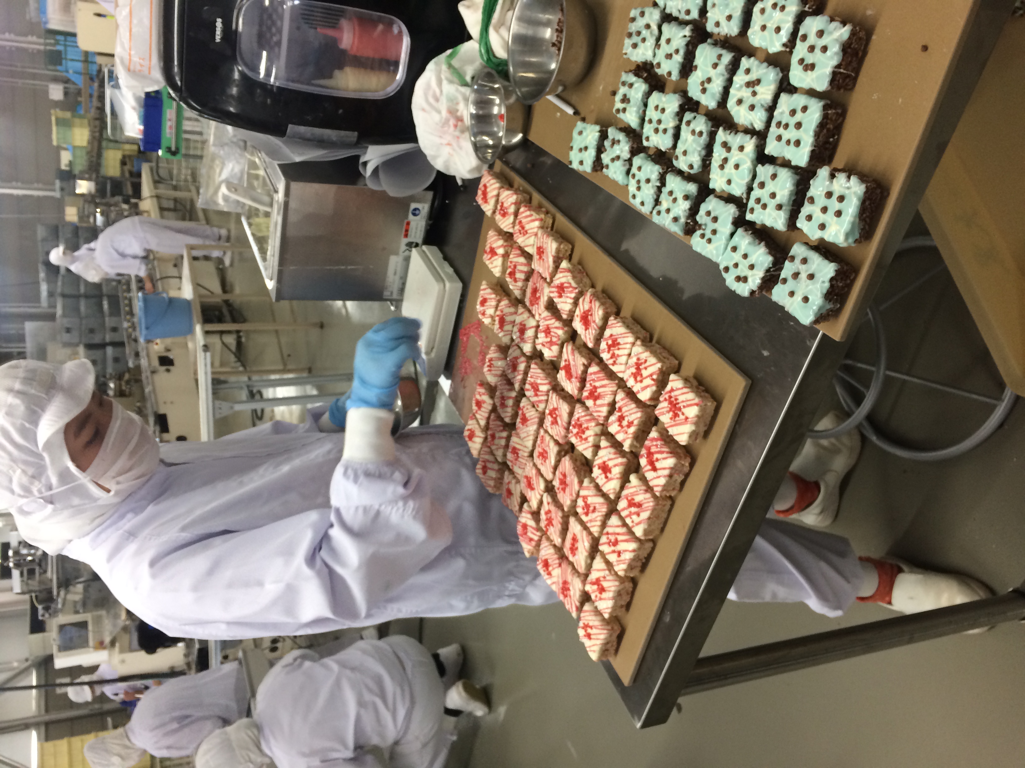 口当たりの良い絶妙な柔らかさの「ライスクリスピートリート」を作るには、繊細なレシピの配合方法と温度管理を必要とします。この作業を支えるのが、200年前から脈々と受け継がれてきた“おこし”作りの工程です。「ライスクリスピートリート」を“おこし”と見立てて、職人が持ち得る限りの知恵と技を出し合い完成させました。出来上がった「ライスクリスピートリート」の上にチョコレートなどをデコレートして行くのは今年入社の新入社員たちです。一品一品、愛情を込めて作り上げる様子は、本場NYの“母の味”を再現する手作りの温かみがあります。