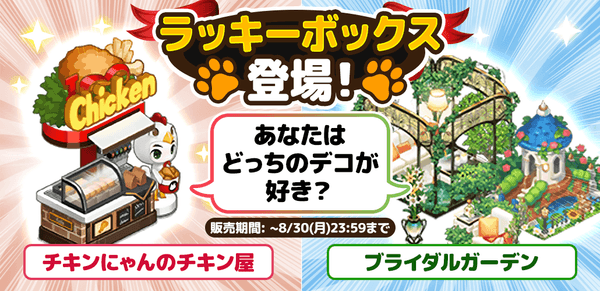 今回のラッキーボックスからは「チキンにゃんのチキン屋」と「ブライダルガーデン」が登場!あなたはどっちがお好み?