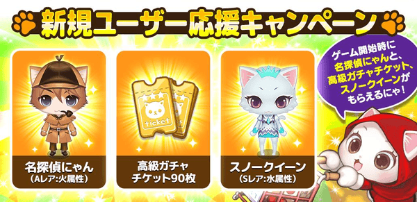 新規ユーザー応援キャンペーンとして、「名探偵にゃん」「高級ガチャチケット90枚」「スノークイーン」が必ず貰えるキャンペーンを実施中!