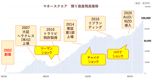 株式会社マネースクエア(本社:東京都港区、代表取締役社長:藤井 靖之、以下「当社」といいます。)は、この度FX取引とCFD取引の預り資産残高の合計額が、2022年11月8日時点で、初めて1,000億円に到達いたしましたのでお知らせいたします。