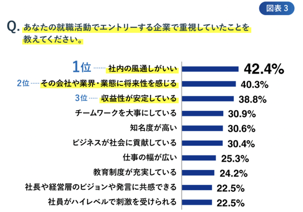 上図は、2023年度卒業予定の大学生に対し、「就職活動でエントリーする企業で重視していたこと」を尋ねたアンケート結果です。第1位は「社内の風通しの良さ」となっており、企業の知名度や収益性よりも企業の社風を重要視する学生の価値観が反映されています。