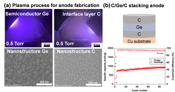 図(a):独自の高圧プラズマスパッタリングでナノ多孔質のゲルマニウム (Ge)/カーボン (C) 積層負極を作製。
