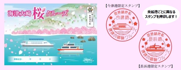 今回新たに販売する「海津大崎桜クルーズ御船印」は、春爛漫の海津大崎をイメージしたデザインとなっており、桜並木や湖岸に点在する岩礁をあしらい、桜の季節ならではの魅力を一枚に込めました。御船印には、購入された港ごとに異なる限定スタンプを押印し、旅の記念としてもお楽しみいただけます。