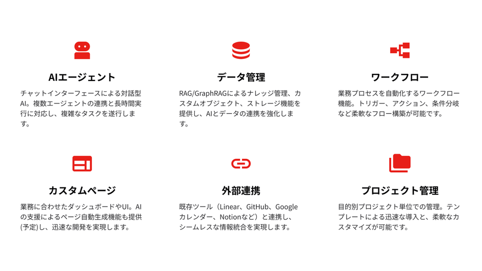 既存システムとの連携を行い、ノーコードでワークフローを開発できます。単なるAIエージェント開発にとどまらず、ビジネスプロセス単位での要件定義・ソフトウェア開発が実現します。開発現場の生産性を劇的に向上し、エンタープライズ企業が抱えるシステム課題を解消します。