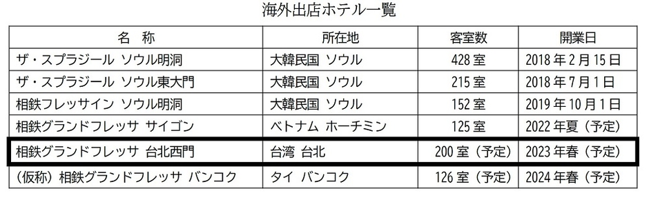 相鉄グループの㈱相鉄ホテル開発(本社・横浜市西区、社長・加藤 尊正)では、2023年春に直営ホテルを韓国、ベトナム、タイに続く海外4カ国目として、台湾・台北に「相鉄グランドフレッサ 台北西門(タイペイシーメン)」を出店します。この出店により、海外における直営ホテルは、6店舗目となります。