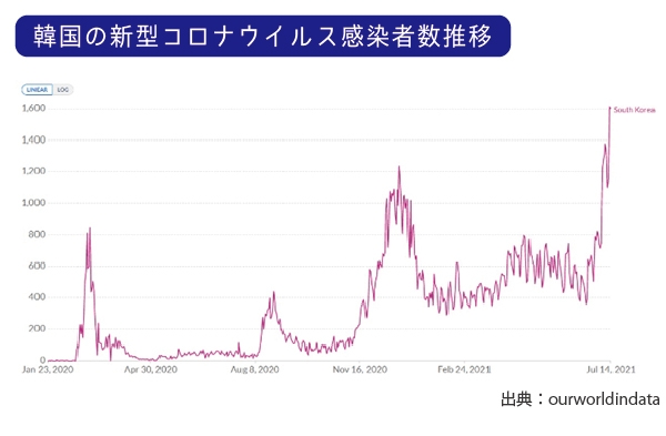 韓国での感染者数は6月12日から急激に増加し、7月17日には一日の新たな感染者数が1400人を突破しました。