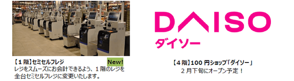 生活関連売り場を2階へ移設し、よりお買い物しやすい売り場にリニューアルいたします。2月下旬には、4階に100円ショップ「ダイソー」が新しく入店し、一度のお買い物で欲しいものがそろう「ワンストップショッピング」を実現いたします。