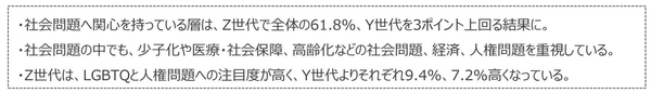 今後の日本やビジネスの中心を担っていく若者、Z世代が今日本の社会に期待することは、何なのか。Z世代の社会問題についての意識を把握することで、彼らの考え方や価値観をより理解する。また他の世代と比較することで、その違いについても把握する。