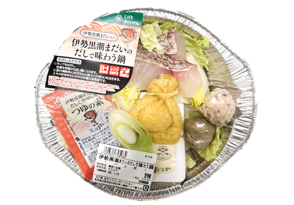「伊勢黒潮まだいのだしで味わう鍋」で使用しているスープは、ライフオリジナルの「BIO-RAL 伊勢黒潮まだいのだしを使用した寄せ鍋つゆ」。加工センターで廃棄されていた頭や骨などを粉末にし、そのエキスを使用して作ったアップサイクル商品です。