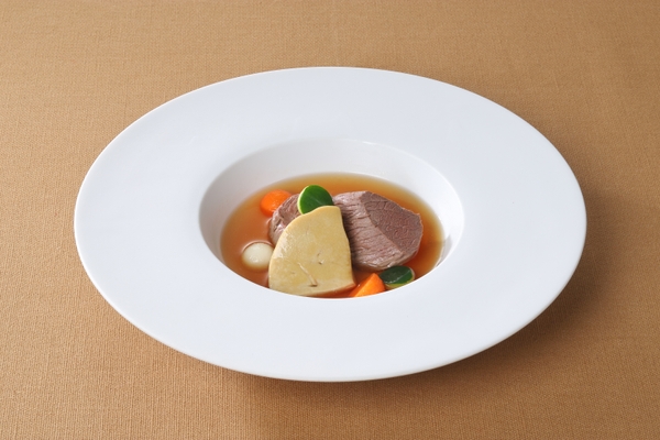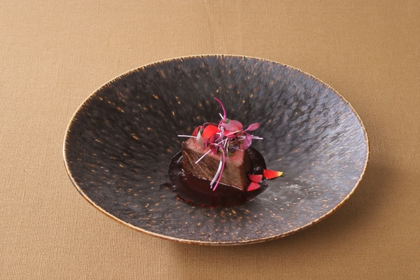 今回は、「NOEL A」・「NOEL B」の2つのコースからお選びいただきます。伝統的なフレンチの技法を用い、素材そのものの良さを感じていただけるよう丁寧に時間をかけて調理したお料理を、カジュアルなコーススタイルでお楽しみいただけます。両コースともオードブルにはじっくりマリネした蝦夷鹿を低温調理で仕上げた「鹿の低温調理 ビーツの香り」、スープには「フォアグラと和牛のポトフ」をご用意。「NOEL A」は魚料理に平目やエビを使用し、メインディッシュにはいわて短角和牛を、また「NOEL B」の魚料理にはオマールエビや甘鯛、メインディッシュには地元京都産のフィレ肉やフランス産のピジョンをご提供いたします。