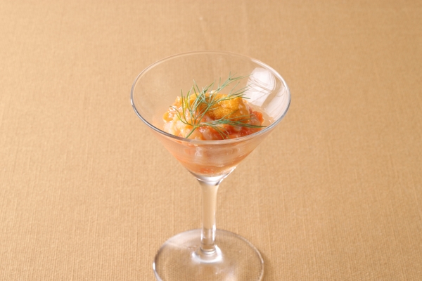 アミューズ サーモンとホタテ貝のタルタル 雲丹風味