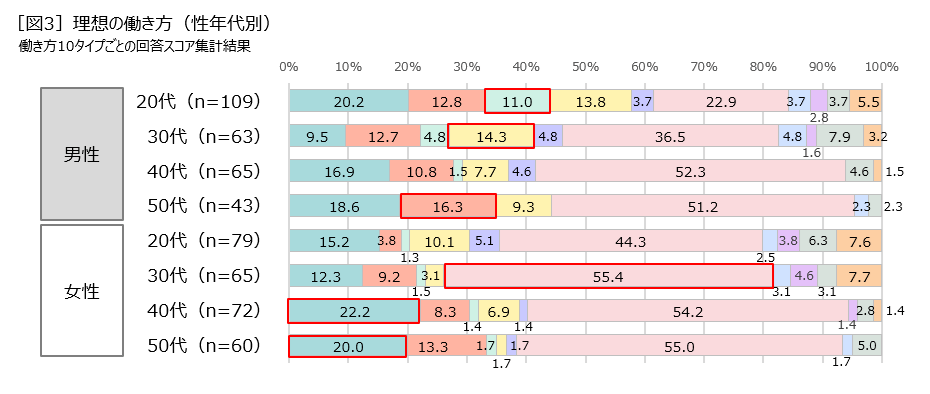 理想の働き方タイプの割合分布を性年代別で見ると、「⑥ワークライフバランス型」が全性年代で最も多く、その中でも、「女性30代」は、55.4%と一番多い結果に。一方、「男性20代」では22.9%にとどまり、「①安定志向型」(20.2%)が僅差で2位となったほか、 「③ポジションアップ志向型」(11.0%)も多い結果になっていますが、他の性別年代と比べてタイプの偏りが少なく、理想とする働き方が多様性に富む様子が分かりました。その他、「男性30代」では「④自己実現・スキルアップ型」(14.3%)、「男性50代」では「②収入重視型」(16.3%)、「女性40代」「女性50代」では「①安定志向型」 (22.2%、20.0%)が多いなど、性年代別の特徴が表れる結果となりました[図3]。