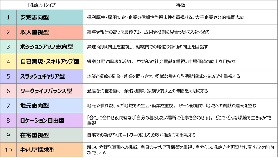「理想の働き方」を下記の10タイプに分類し、回答者は、タイプごとに設定された代表的な価値観フレーズへの共感度を5段階で評価。回答スコアを項目ごとに合算し、最高得点となったタイプを回答者の「主タイプ」として、理想の働き方のタイプを導き出しました。設問や集計方法の詳細は、本プレスリリースの末尾で紹介しています。