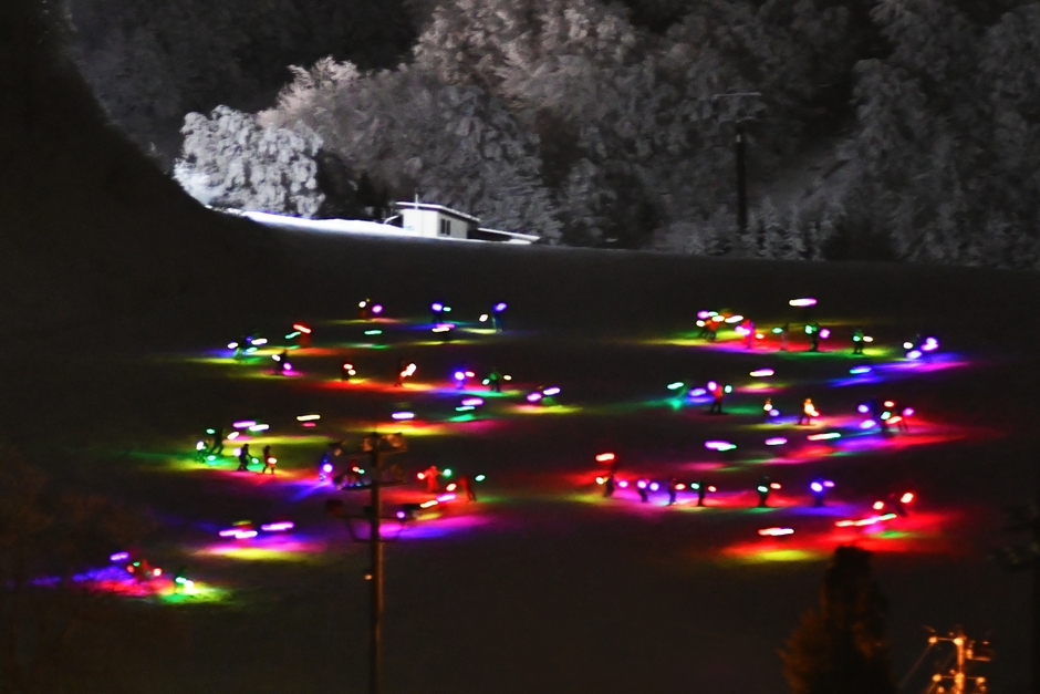 LEDライトの松明を手に夜の雪上を彩る。冬の花火と共に、特別な体験を