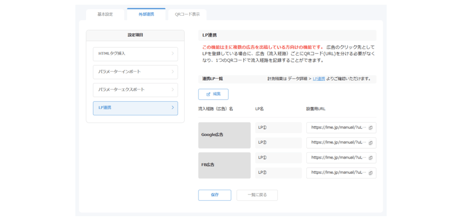 広告のクリック先としてLP(ランディングページ)を登録している場合、広告ごとにQRコード(友だち追加URL)を作成する手間がなくなります。ひとつのQRコードで、それぞれの広告からの流入経路を把握できます。