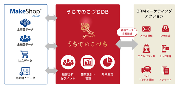 「うちでのこづち」は分析機能を強みとし、800社以上の通販分析の要望を機能に反映することで、業界ニーズに即した顧客分析を行うことができます。「MakeShop byGMO」で構築されたECサイトに導入することで、商品・顧客・注文データなどを連携し、メール配信、DM、アウトバウンド、SMS配信、DMP広告配信など、様々なMA施策を自動化、効果検証までを一気通貫し、リピート売上・LTVを拡大させることが期待できます。