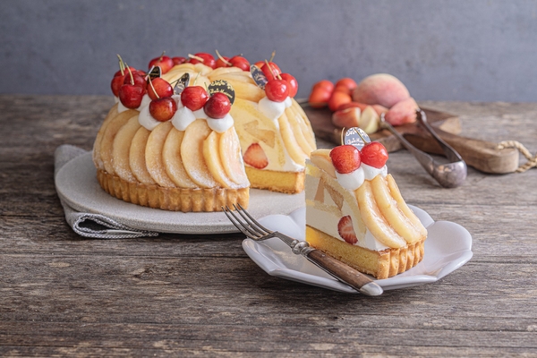 香ばしいアーモンドタルトに白桃といちごをディプロマットクリームで包み込みました。糖度12度以上の甘さの特秀品にあたる最高糖度の桃『大糖領』とさくらんぼを贅沢に使用したタルトです。
