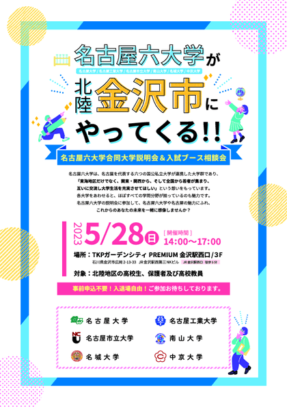 このたび、名古屋を代表する6つの国公私立大学が連携した大学群である、名古屋六大学が金沢で大学説明会および相談会を実施します!