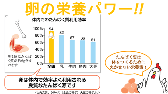 実際に、卵のタンパク質の体内での利用効率は94%と、実は肉、魚、大豆、乳製品よりも高く、体の中でとても効率よく利用されるのです。