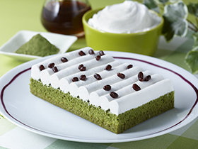 宇治抹茶を使用したふわふわのスポンジ生地にさっぱりとした甘みの黒蜜シロップを染み込ませ、コクのある豆乳クリームをたっぷり重ね、まろやかに仕上げました。この豆乳クリームには素材の旨みを強める効果があり、繊細な和素材の風味を強めています。また、食感のアクセントとして、上品な甘さの「かのこ」をトッピングしています。抹茶・黒蜜・豆乳といった3つの和素材が絶妙にマッチした日本のケーキに仕上がりました。