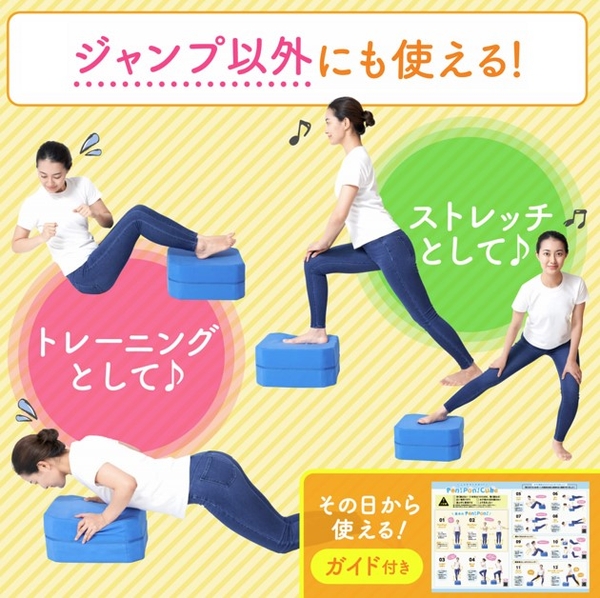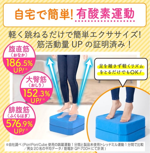 Pon!Pon!Cubeは基本のジャンプ運動のほか、腹筋運動や踏み台昇降、ストレッチにも使えるため、これ一台で簡単に有酸素運動、ストレッチ、体幹トレーニングができます。