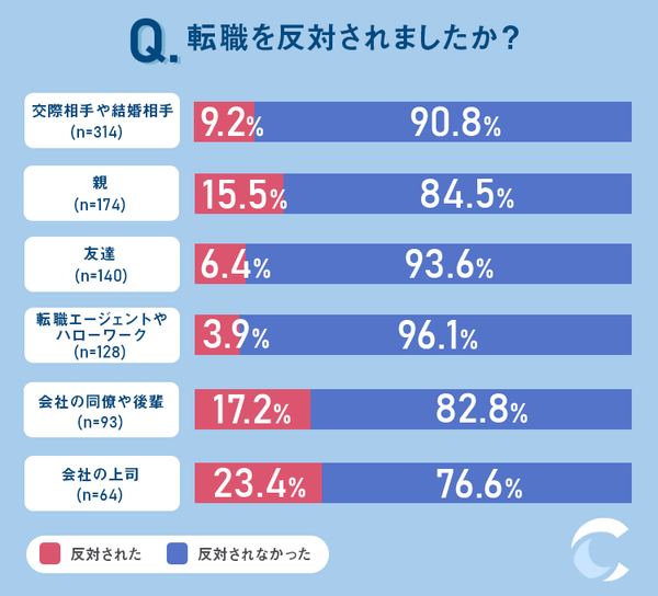 全体的に見ても、相談相手に転職を反対されることは少ないようです。