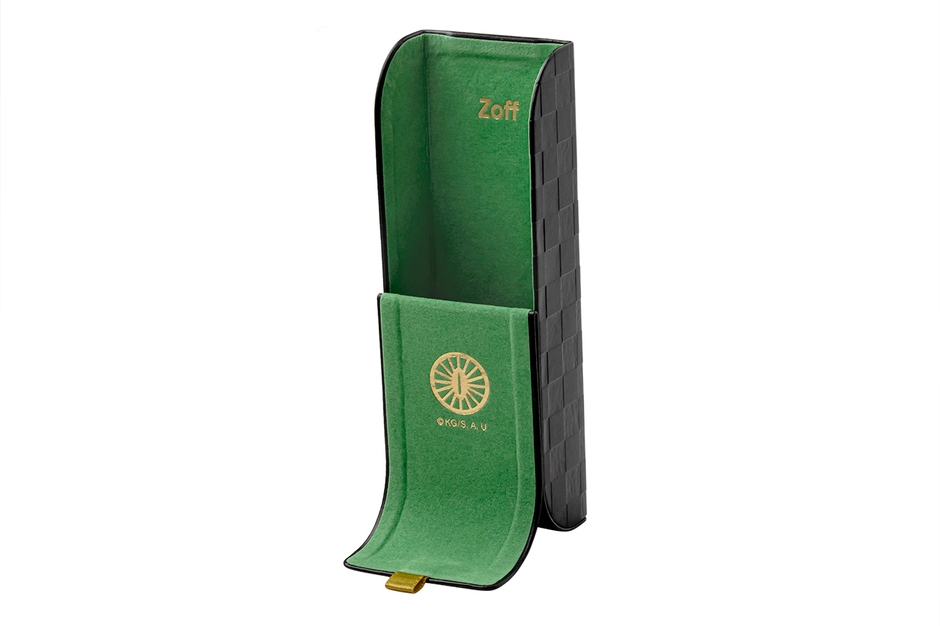 持ち運びもでき、ふたを開ければ立てられる便利なスタンドメガネケースは各キャラクターの羽織の色と柄をデザインに落とし込み、日輪刀の鍔(つば)も内側にプリントで表現しています。
