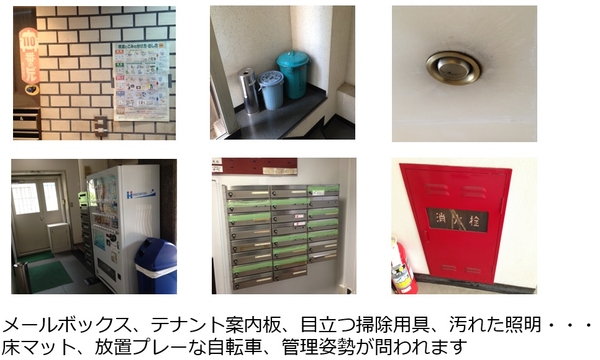 他には、天井の照明、特にエントランスは雰囲気よくするために電球を使うことが多いので、熱とかでススケてしまうことが多いです。消防設備のガラスとか消火器の置台が割れてたり、掃除用具が目立つとか、ゴミ出しとか火の用心のポスターが壁にデンと貼ってあるとか、とても残念です。