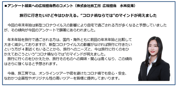 “コロナ禍”での年末年始の過ごし方や旅行に関する意識の実態を反映した、年末年始間近のアンケート調査(速報)となっております。報道の一資料として、ぜひご活用ください。
