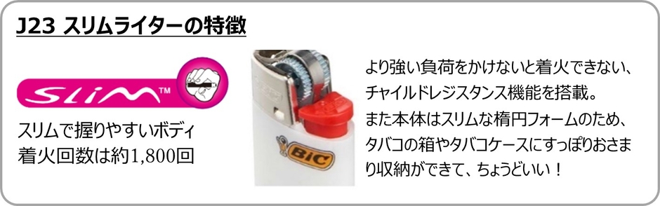 BICライターは、本体には耐熱性・耐圧性の高くて厚みの薄いデルリン樹脂を使用し、さらに安全基準を遵守した上でガス充填量をより多くしています。製品の生産精度の高さから、ガスを使い切るまでの着火確度を上げることで、ライターの使用期間を長持ちさせています。J26レギュラーライターは約3,000回の着火回数(一般的なライターの約3倍)。ごみ消費も1/3に抑える地球にやさしいライターです。