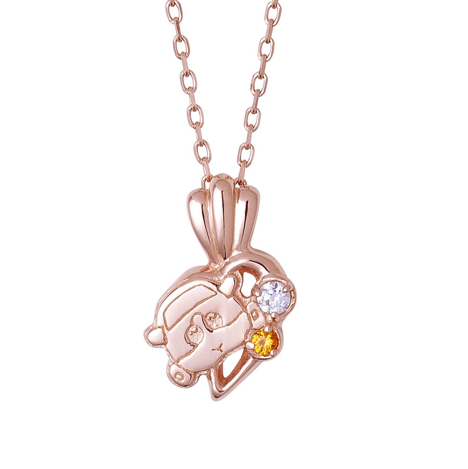 ニンジンモチーフをデザインに取り込み、ポテトとイメージカラーストーンをセット。ピンクゴールドコーティングで仕上げました。