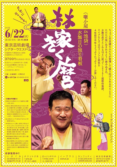 株式会社いがぐみ(東京都豊島区)主催、『《噺小屋in池袋》水無月の独り看板 林家きく麿』が2022年6月22日 (水)に東京芸術劇場シアターウエスト(東京都豊島区)にて開催されます。チケットはカンフェティ(運営:ロングランプランニング株式会社、東京都新宿区、代表取締役:榑松 大剛)にて発売中です。