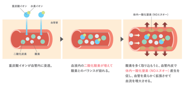 このような問題に対処する一つの方法が重炭酸温浴です。高濃度の重炭酸イオンが温水に溶け込み、皮膚から吸収、血管に浸透することで、血管内で体内一酸化窒素(NO)の生成が促進され、このNOが血管を拡張させて血流を一気に向上させます。