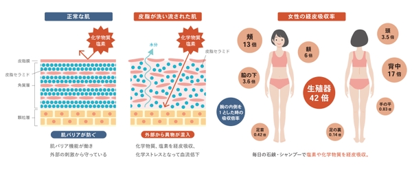 女性の悩みにある、睡眠障害・PMS・更年期障害・生理不順など多くは冷えからといわれ、その原因は、肌バリアの弱い生まれたての赤ちゃんや女性の生殖器の経皮吸収率が大きく、入浴時の化学洗剤や残留塩素などの化学物質を経皮吸収してしまい、この経皮化学ストレスによって自律神経が偏り血流が低下し、ホルモンの分泌が乱れ、体と心の不調に繋ってゆくものと思われています。それ故入浴時の化学物質を如何に減らすかが、血流を上げ「冷え」を改善し女性と赤ちゃんの健康と美容を守る鍵になると考えております。
