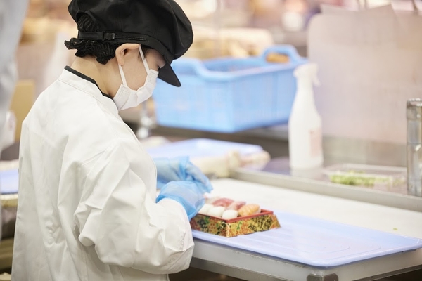 子どもたちからも身近な存在であるスーパーマーケットとして、森ノ宮店では寿司の製造や商品の品出し、レジ打ちなどをご体験いただきました。